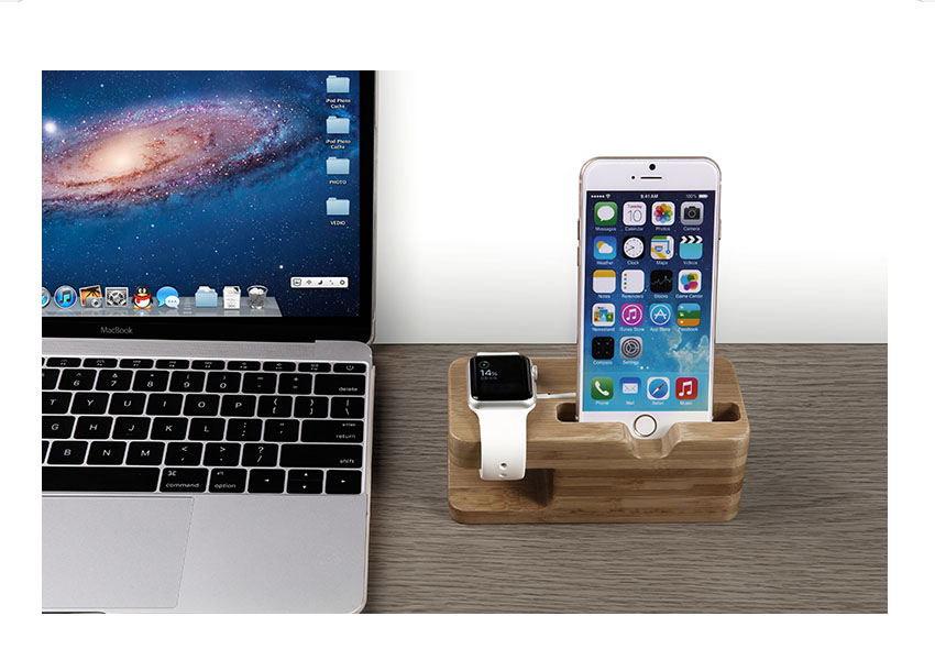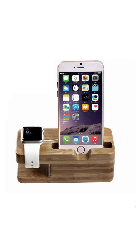 Genuine natural wood docking station for iPhone 6 and Apple Watch 38mm 42mm. Special cutout for the Apple Watch charger and cable, non-slip base and no-scratch padding hold your Apple devices in place on desk or table top. A great place to keep your Apple Watch clean and safe while charging.